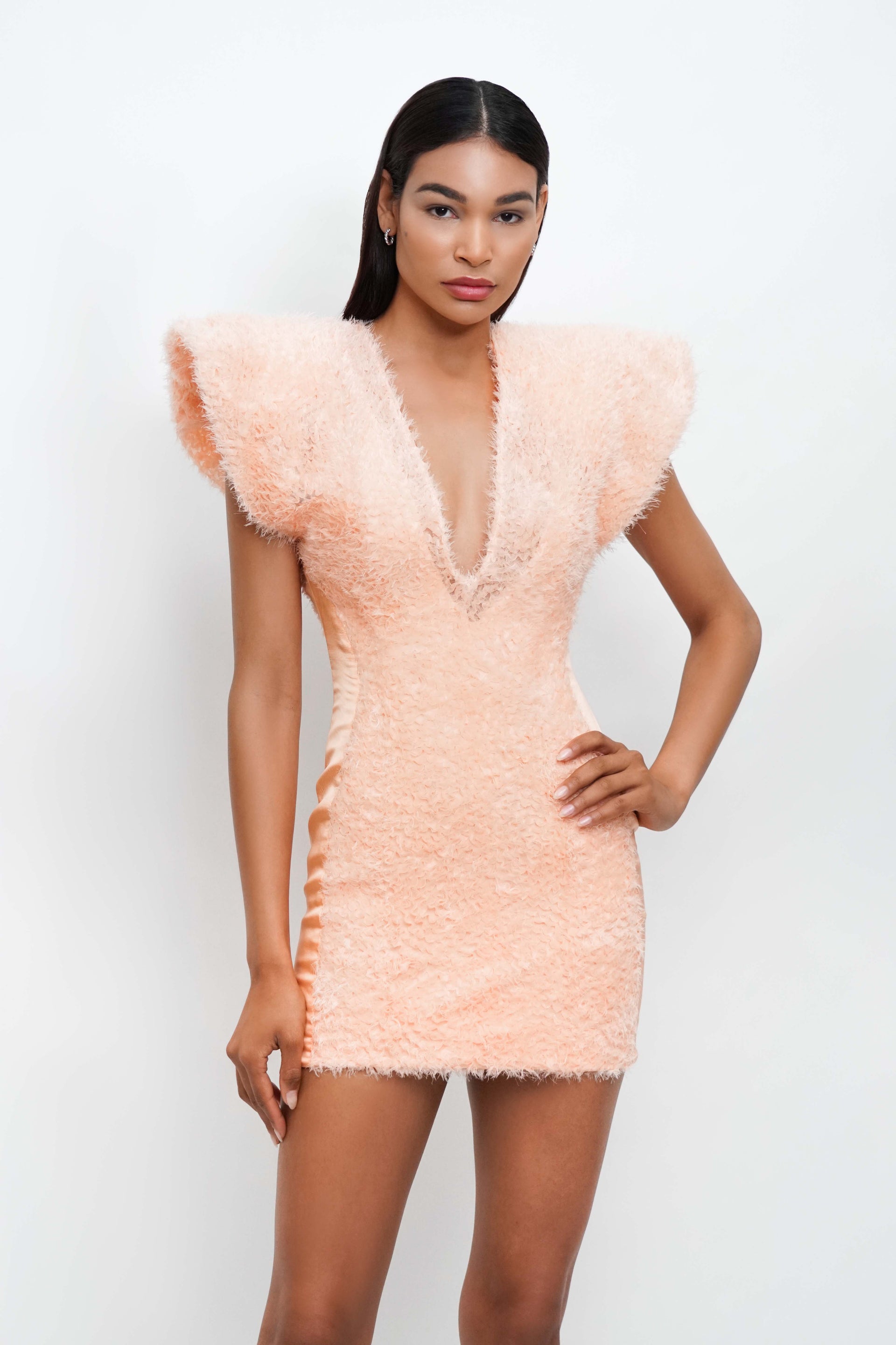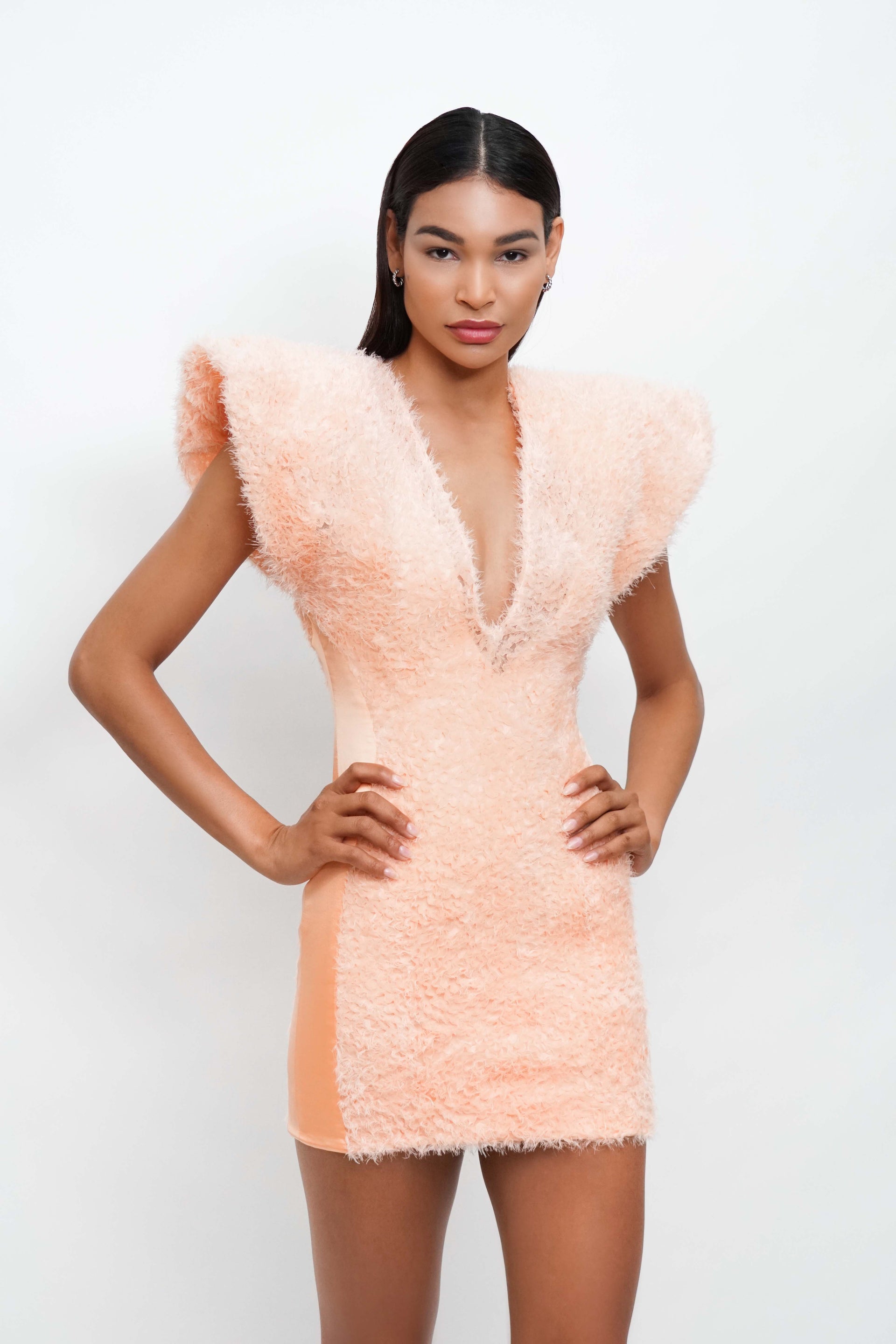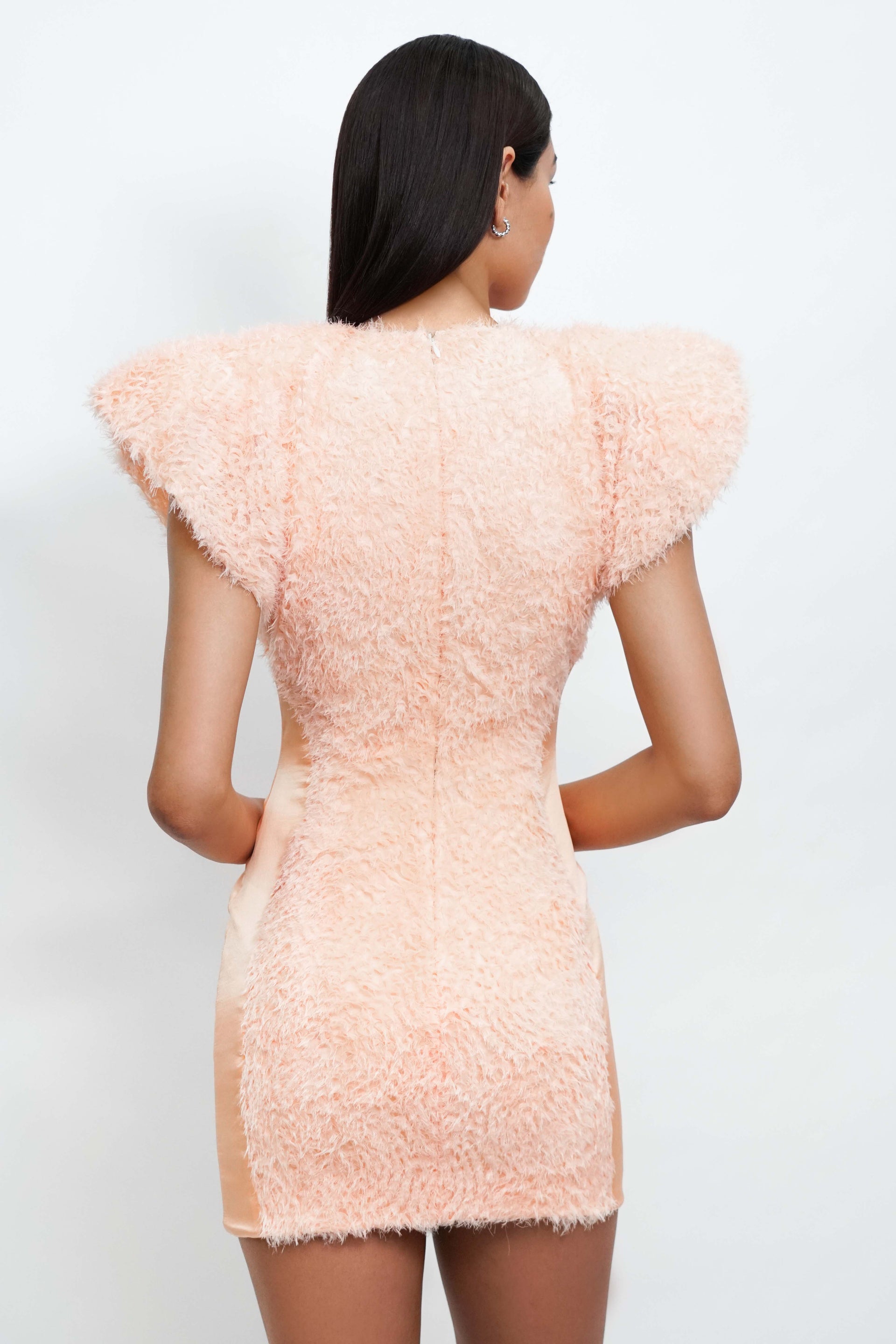 Vestido de festa curto e justo, decote em V, ombros muito altos com estampa gráfica e mix de materiais, seda com flores 3D Composição: Exterior: 100% SEDA | 100% Poliéster |