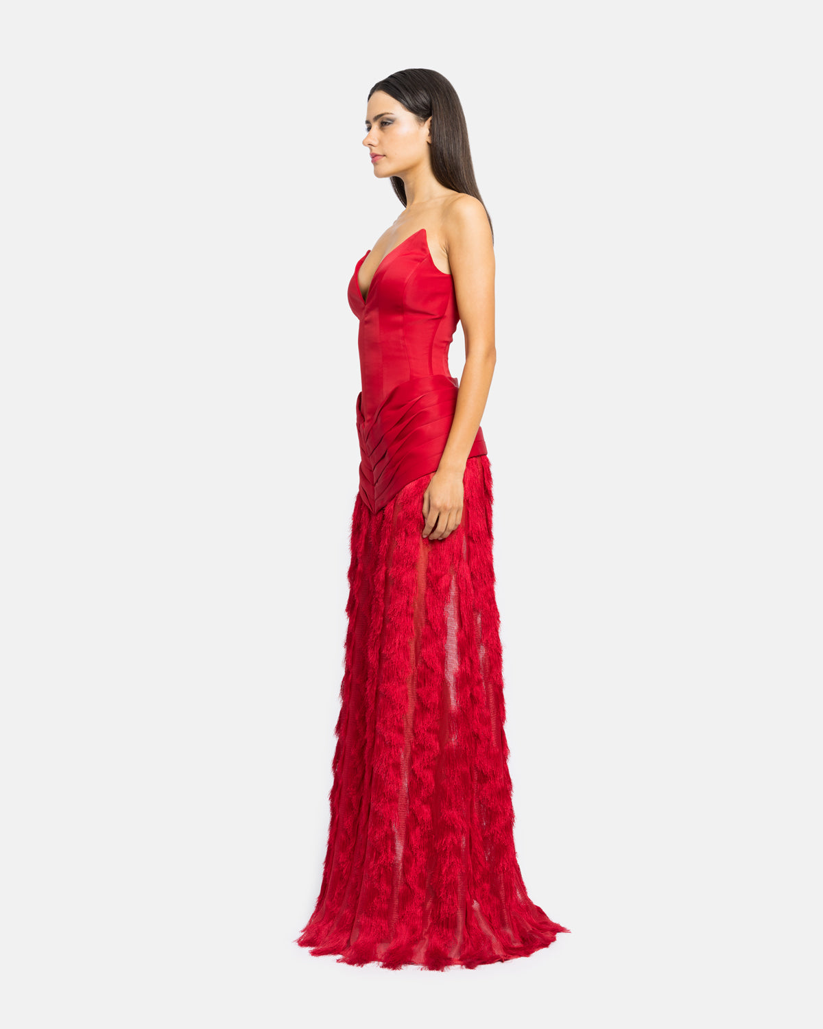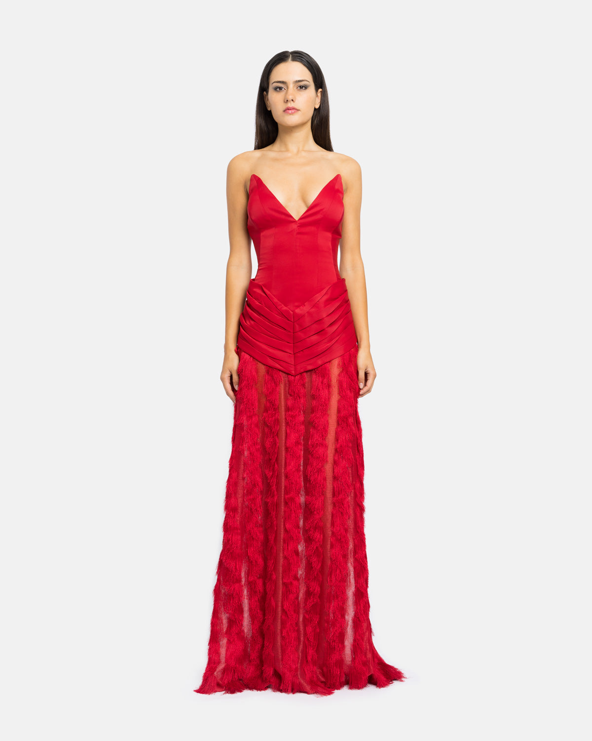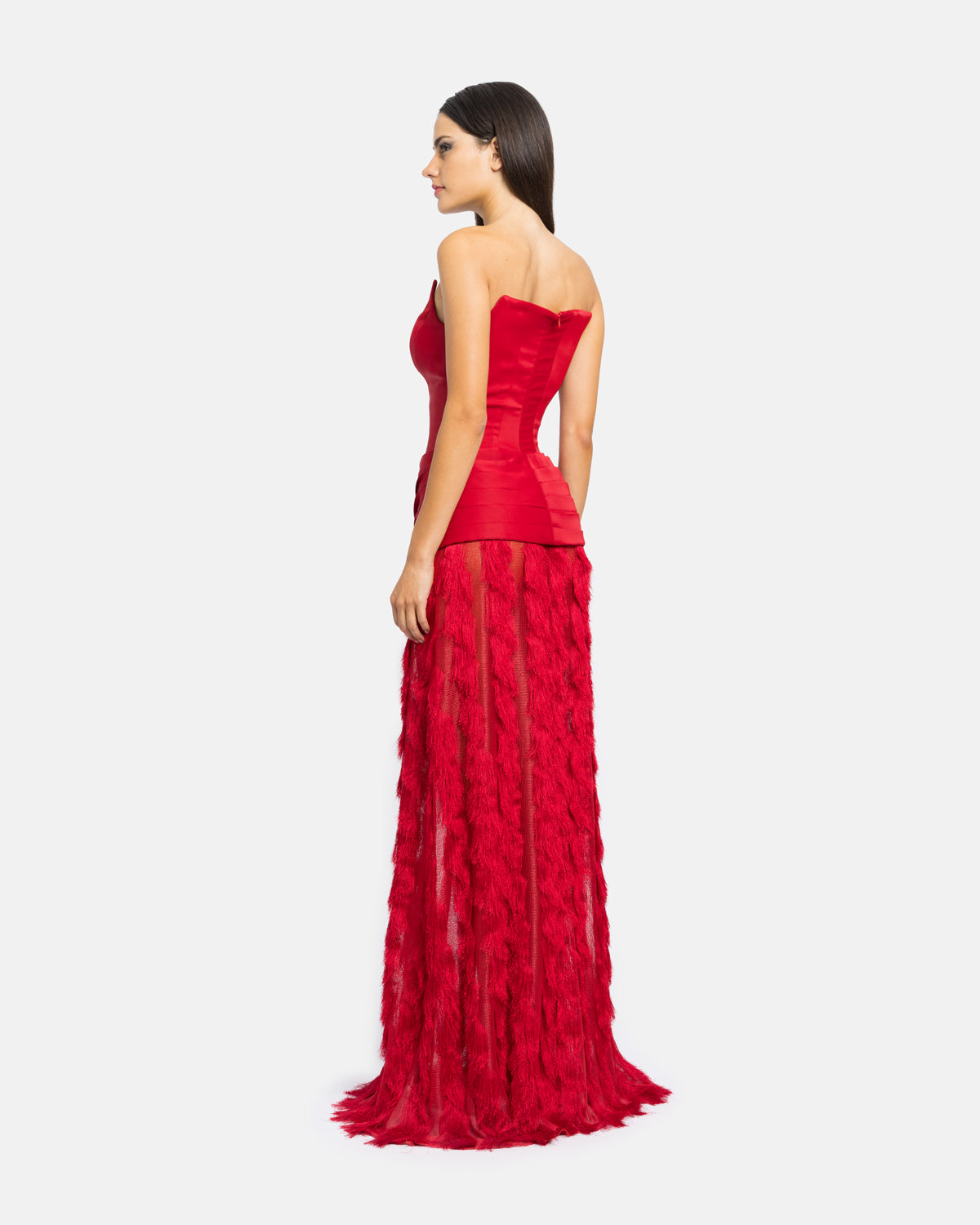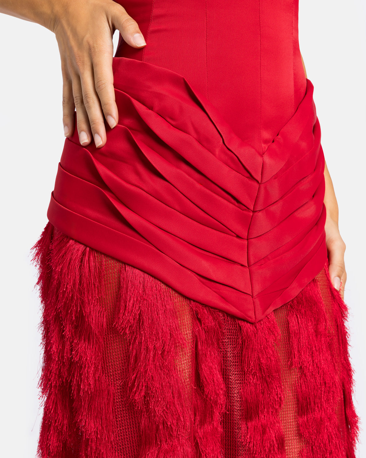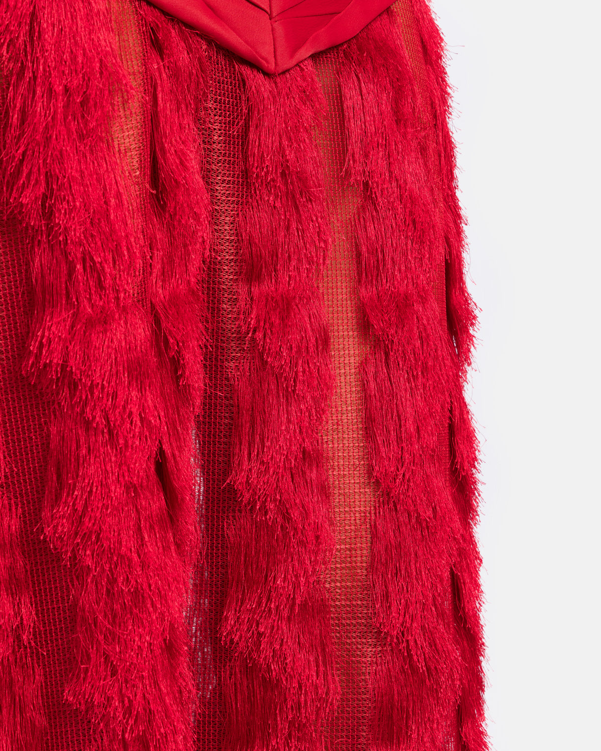 Vestido longo com materiais mistos, decote estruturado, corpete assimétrico drapeado e saia com franjas. Composição: Exterior: 81%CA 16%Viscose 3%Elastano |