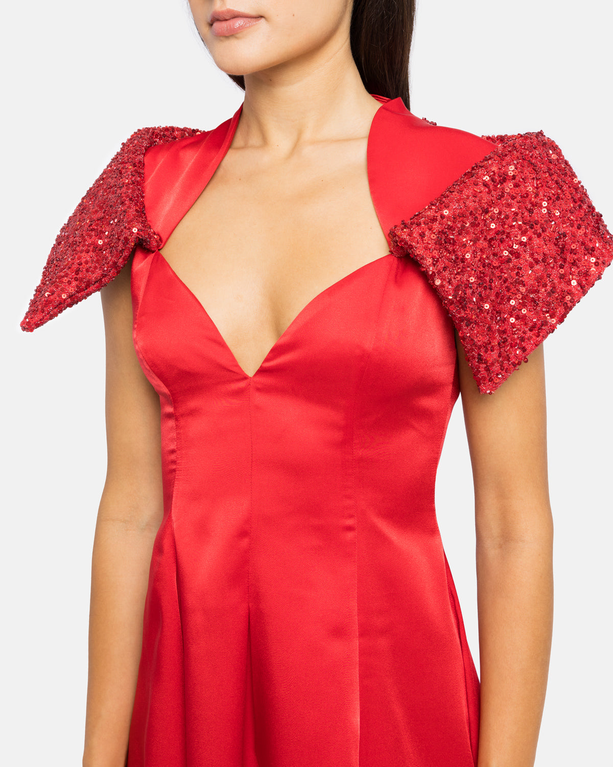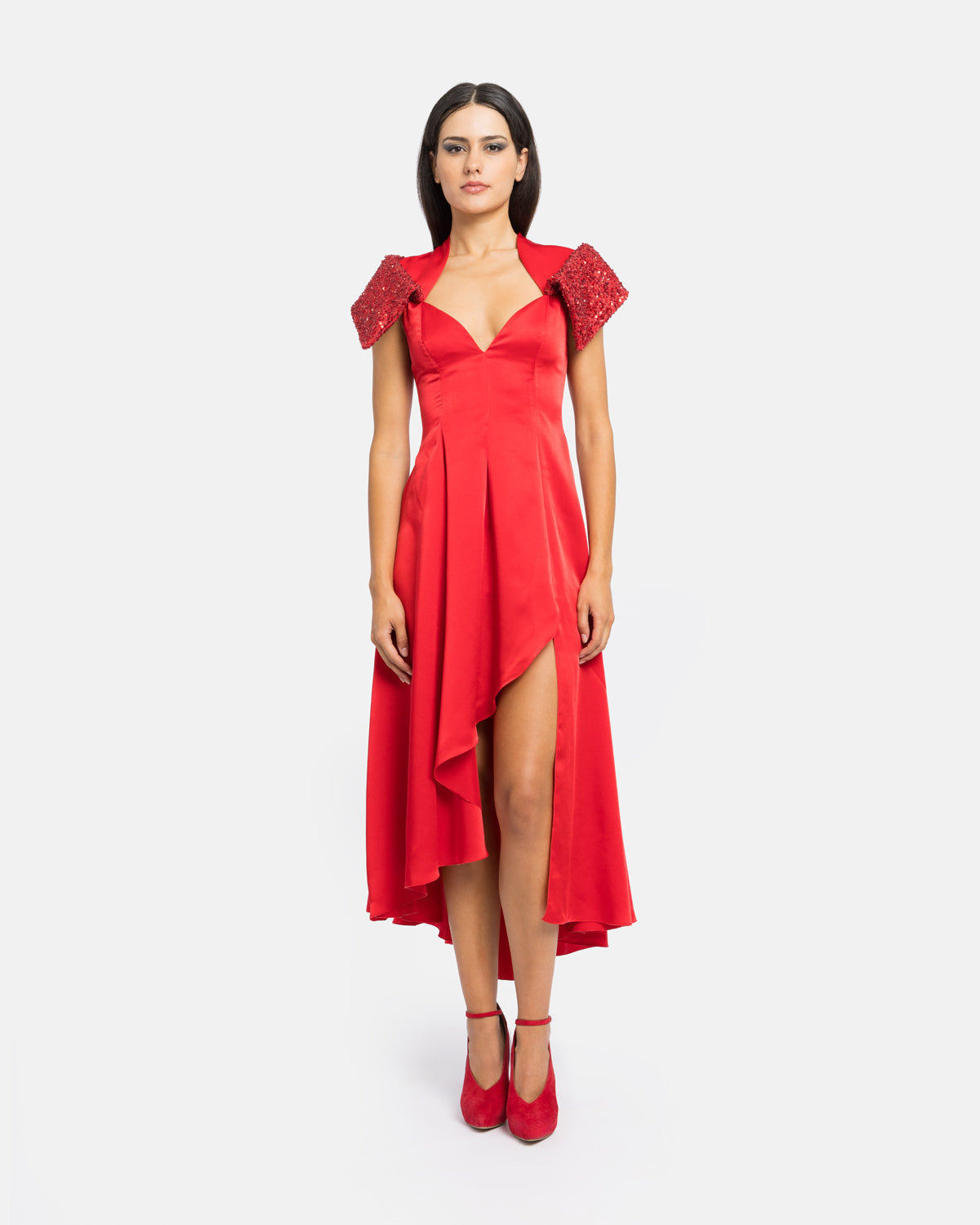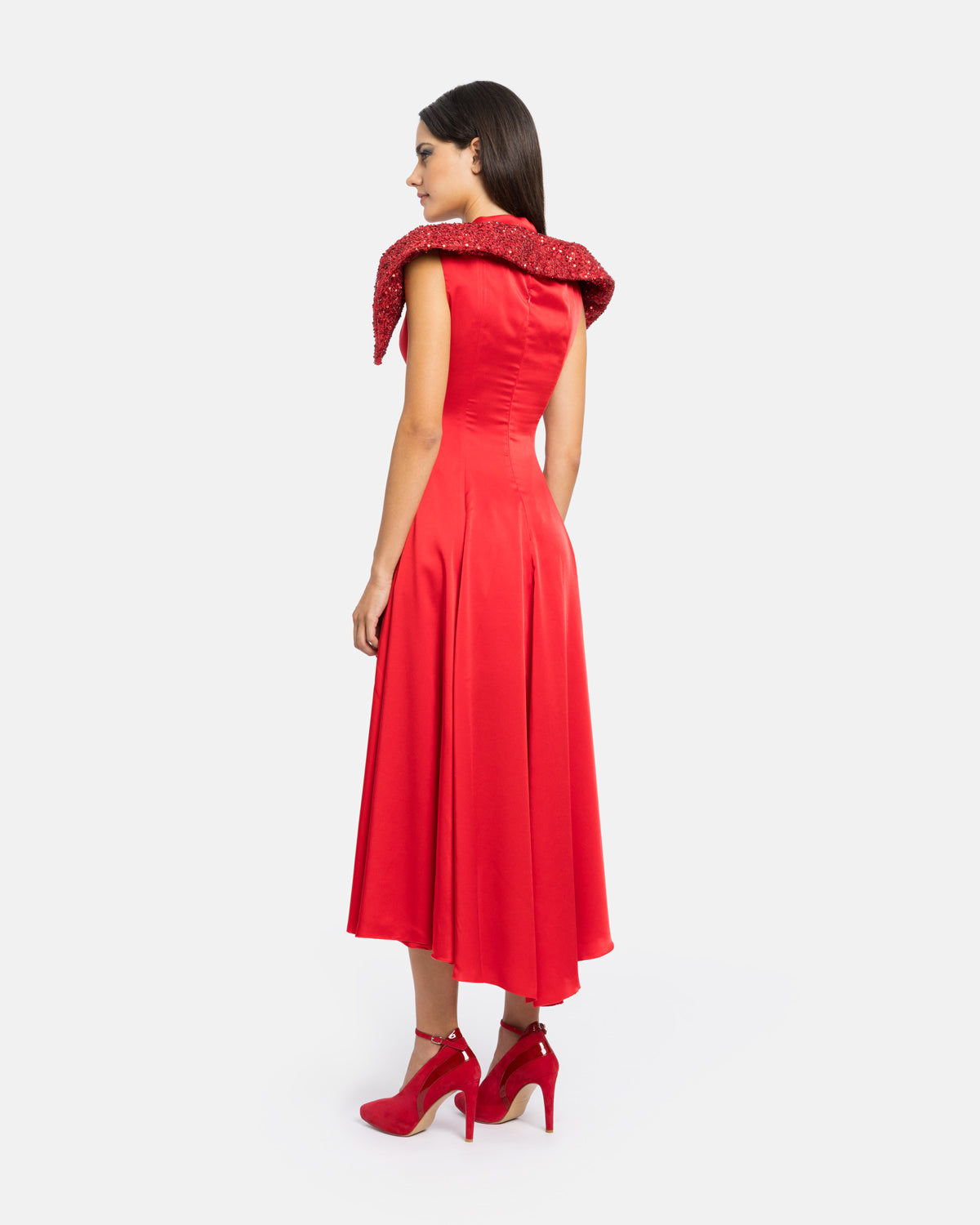 Vestido midi com mix de materiais, gola e decote alto, fluido na assimetria, com segunda gola gráfica rígida em flores 3D. Composição: Composição: |