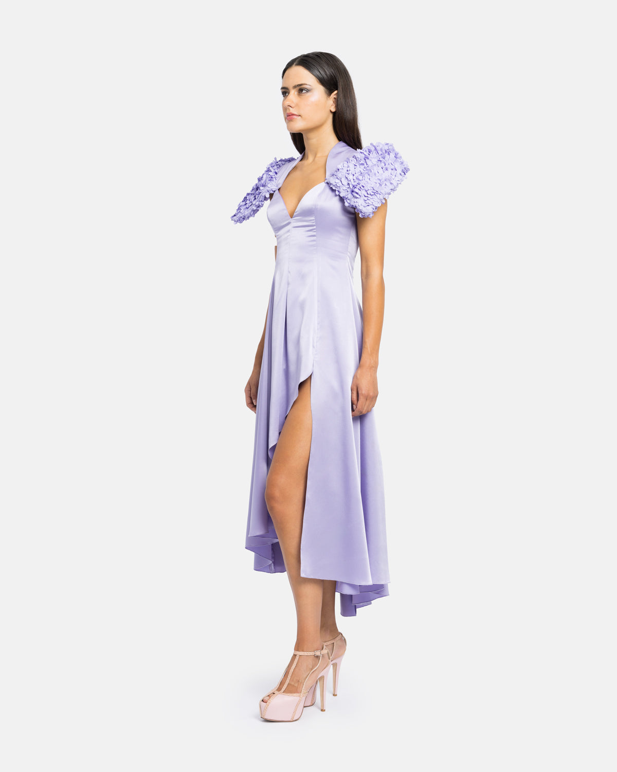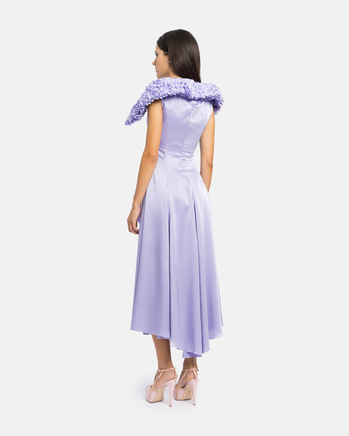 Vestido midi com mix de materiais, gola e decote alto, fluido na assimetria, com segunda gola gráfica rígida em flores 3D. Composição: Exterior: 100% poliéster | 100% poliéster