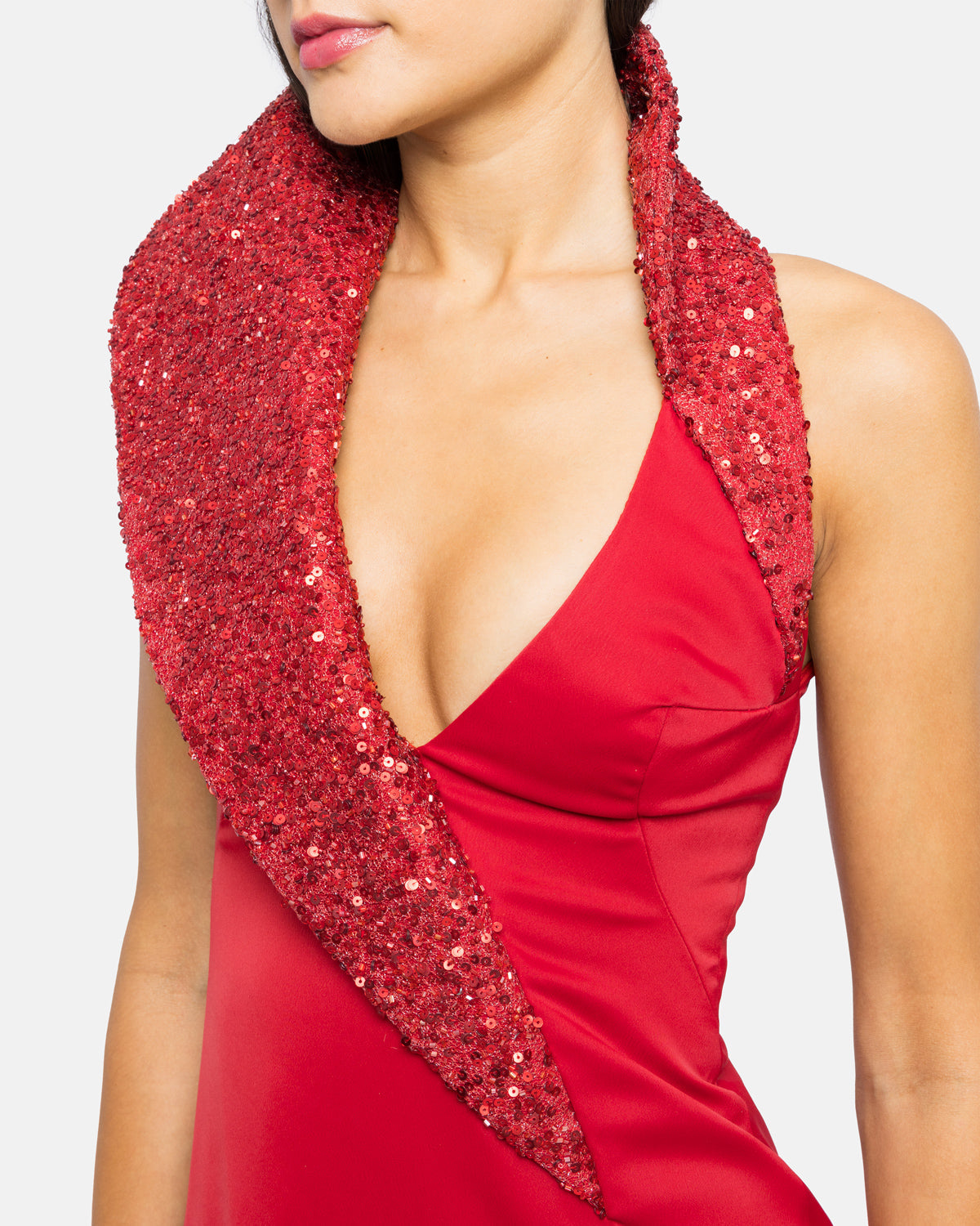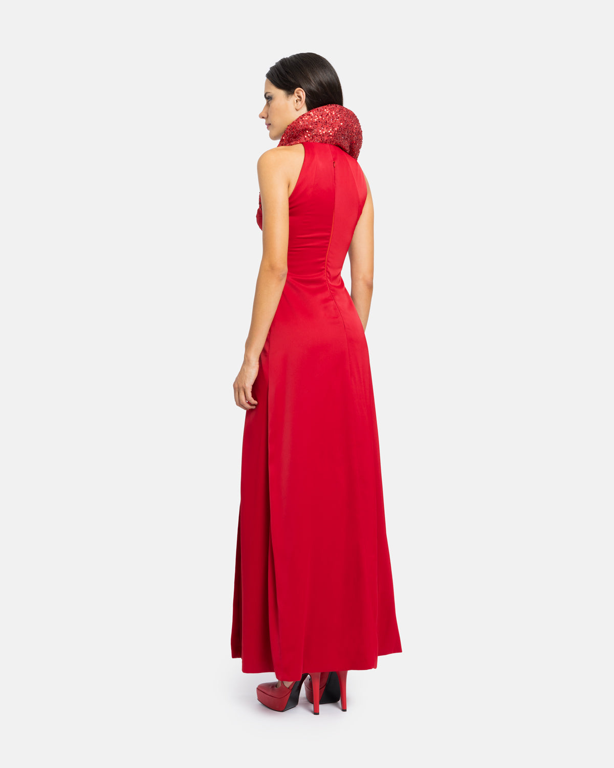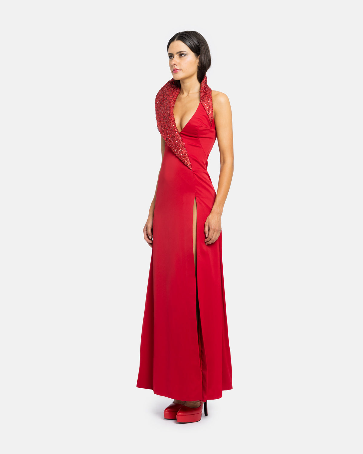 Vestido longo com mix de materiais, decote em V, gola estruturada em paetês e pedraria com assimetria. Composição: Composição: |