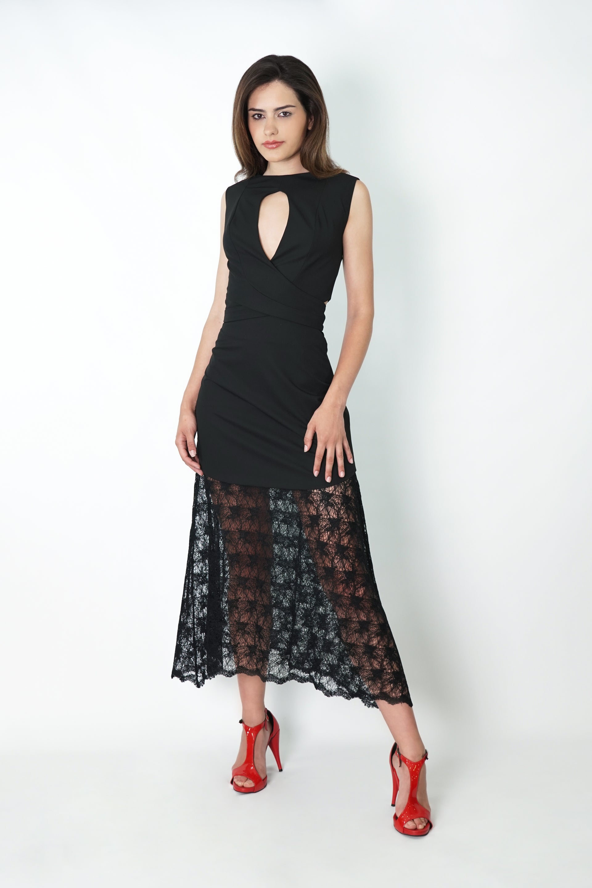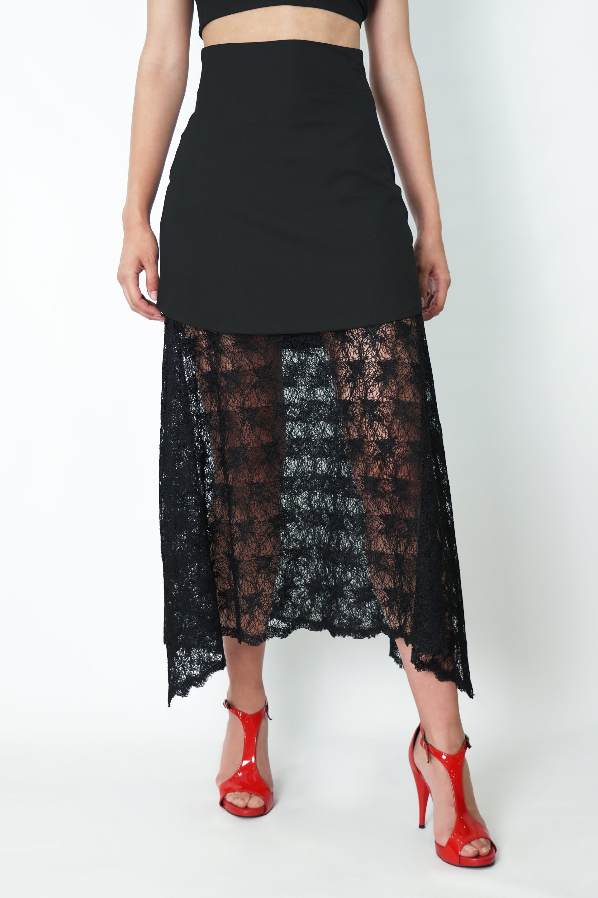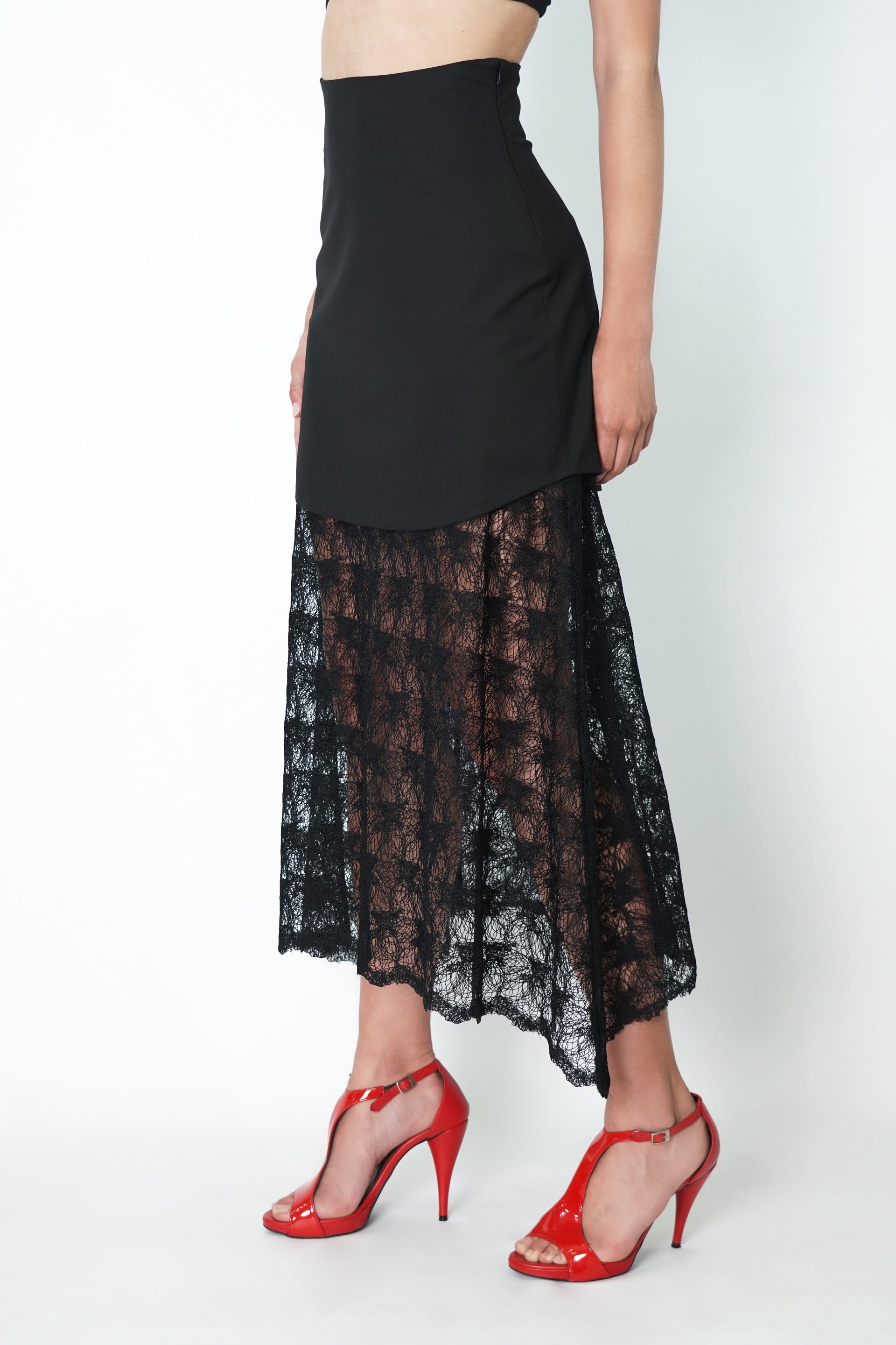 Saia midi de renda, sobreposta com mini saia de cintura alta